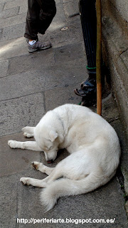 Se llama Luna aunque parezca la Bella Durmiente. Me la encontré hace unos días durmiendo placidamente al lado de la oficina del peregrino, esperando que sus dueños consiguieran la compostela.